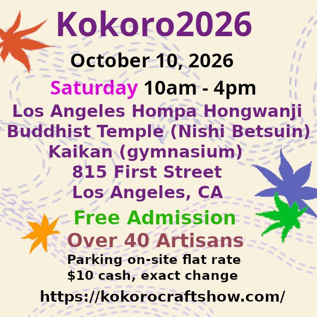Friends of the Japanese American National Museum will be celebrating the 17th Anniversary of the Kokoro Craft Show.  We extend an invitation to the in-person Kokoro2025 Craft Show to be held on SATURDAY, OCTOBER 11, 2025, 10:00 a.m.- 4:00 p.m., at the Los Angeles Hompa Hongwanji Buddhist Temple (Nishi Betsuin).